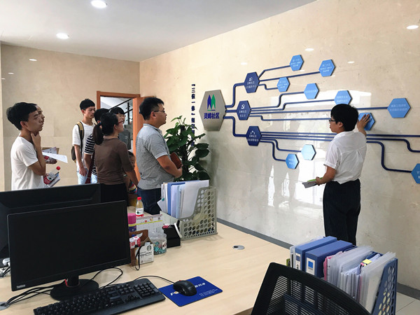 首先张日益老师向社区表明我们此行的目的,社区张主任对于我们的到来表示热烈地欢迎,并且感谢我院大学生伸出的援助之手,为社区提供兼职社工。在社区工作人员的引导下,党员们首先参观了社区民族工作室、七彩风民族文化艺术团、假日学校、网格工作体系等。随后针对加强结对共建单位的合作、党建管理思路展开座谈。座谈会上,张国庆详细介绍了社区的基本情况,党建特色“红立方”及两网融合体系。张日益老师向社区了解了学生暑期“兼职社工”挂职锻炼与服务的开展进度。然后,双方关于“两学一做”的有效开展和具体措施进行研讨。目前,社区与海天学院师生已开展多次共建合作活动,其中有学生为社区居民维修小家电、出演社区文艺晚会、制作垃圾分类墙绘、积极参加垃圾分类工作、争当环保志愿者等等。