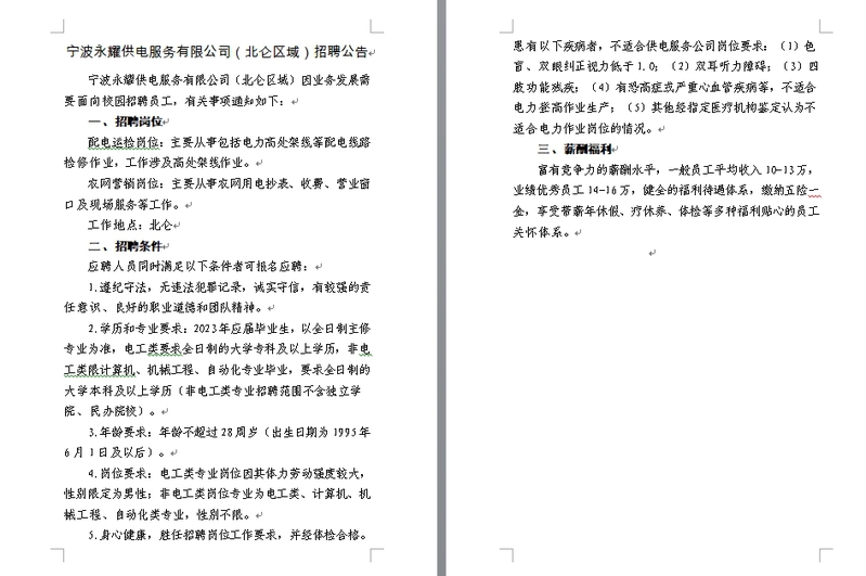 宁波永耀供电服务有限公司(北仑区域)招聘公告
