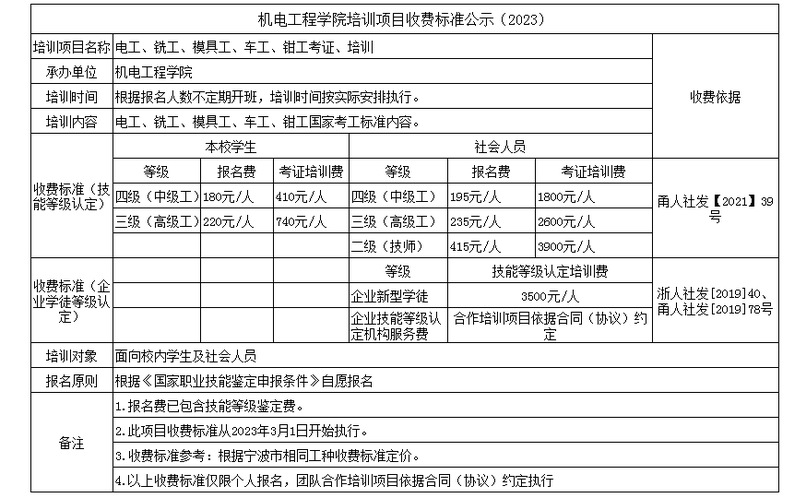 培训项目收费标准公示
