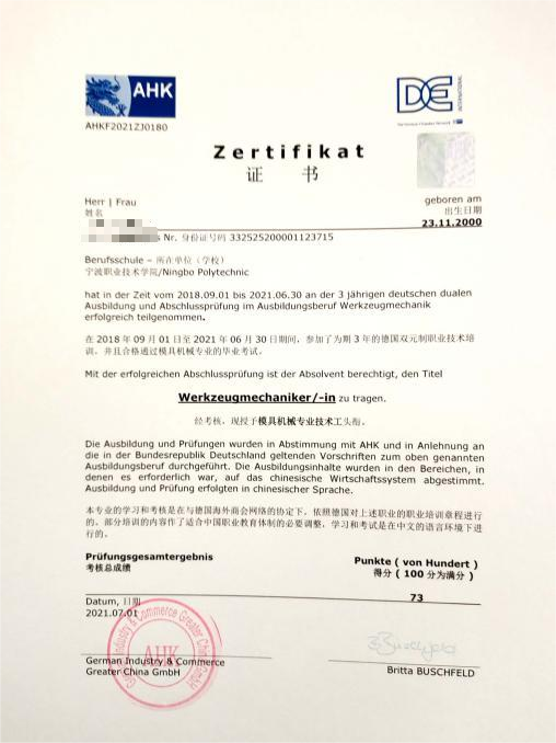 2021、22届学生95%获德国AHK职业资格; 2022届毕业生朱家玮、岑棨涛获得最佳创业项目一等奖。分院教师将企业横向课题开发成教学项目的同时,积极组织和指导学生参加技能大赛、挑战杯、互联网+竞赛、创新设计比赛。开发教学载体 17多项,同时授权发明、实用新型专利38项。