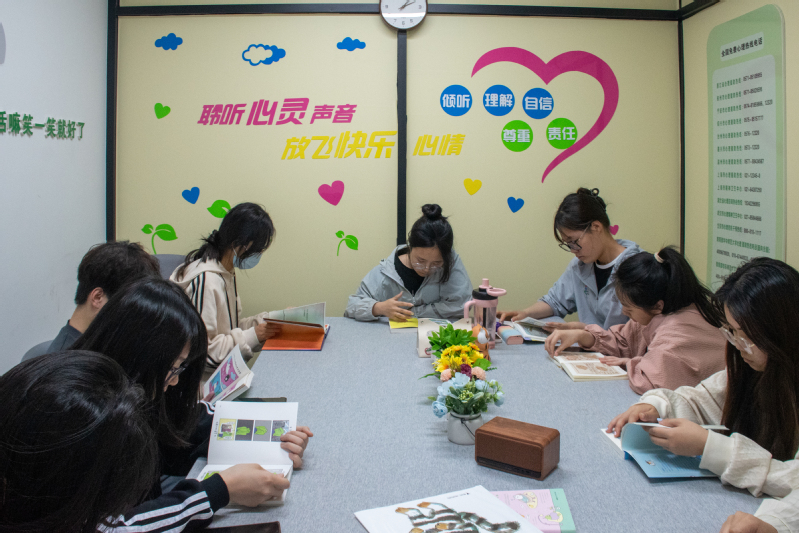 活动筹备期间,心感觉能量站成员精心挑选了《啊呜一口,吃掉烦恼》《我越来越喜欢自己了》《只有春天和爱允许入内》等优质绘本。活动当天,在心理辅导员的带领下,在音乐声的陪伴中,参与者们通过沉浸式共读,在轻松愉悦的氛围中开启了一段心灵疗愈之旅。