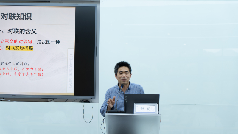 讲座以对联为切入点,系统阐述了对联的含义、文化地位、特质、起源和发展等内容,重点解析了对联文化的博大精深。程老师通过多媒体演示,在欣赏名联的同时,让学生思考下联,生动展现了对联所蕴含的奥秘,用中国独有的“两行文学”,看尽方寸红纸承载千年的哲思与诗意。
