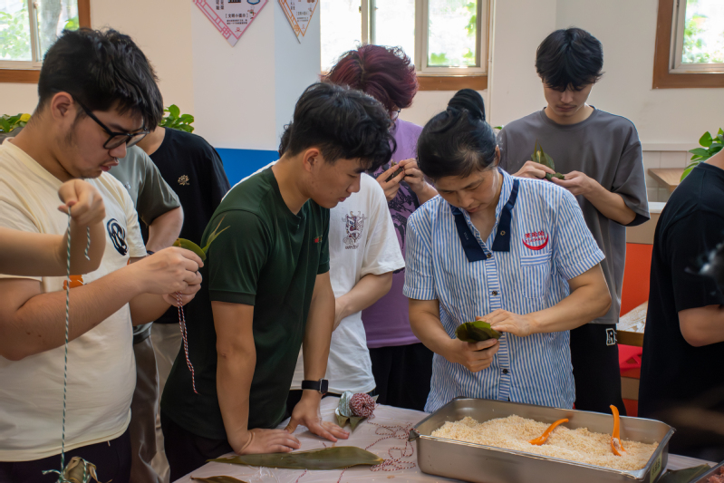 活动现场,食堂工作人员早早备好了翠绿的粽叶、雪白的糯米、鲜红的蜜枣及肥瘦相间的五花肉等食材。在食堂阿姨的示范下,包粽子活动正式拉开帷幕。“先将粽叶卷成漏斗状,放入糯米后压实,再用棉线缠绕固定……”师傅边讲解边演示,师生们围在操作台旁仔细观摩。起初,不少同学因手法生疏,出现粽叶破裂、馅料溢出等情况,但在互相帮助与反复练习中,逐渐掌握了“折叶、填馅、包裹、捆扎”的技巧。随着时间推移,桌上的粽子从歪歪扭扭变得棱角分明,青绿的粽叶包裹着糯米的清香,现场欢声笑语不断,洋溢着浓厚的节日氛围。