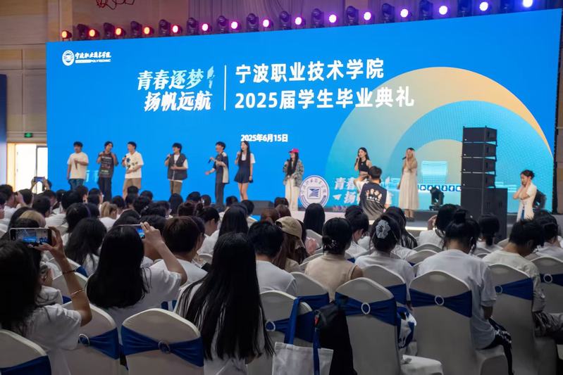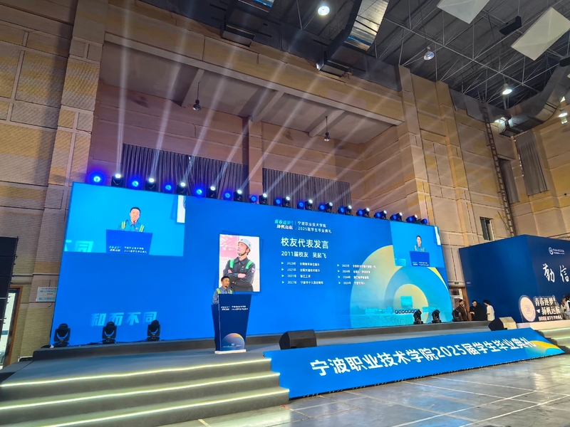13时整,毕业生身着白色文化衫前往学校顾国华体育馆。典礼在庄严的国歌声中拉开帷幕,舞台上,随着关于准予2025届学生毕业的决定的宣读,在场毕业生聆听了学校老师的深情祝福、分院优秀校友的激情发言、校长语重心长的寄语,大学校园的时光在校歌的旋律中画上了圆满的句号。