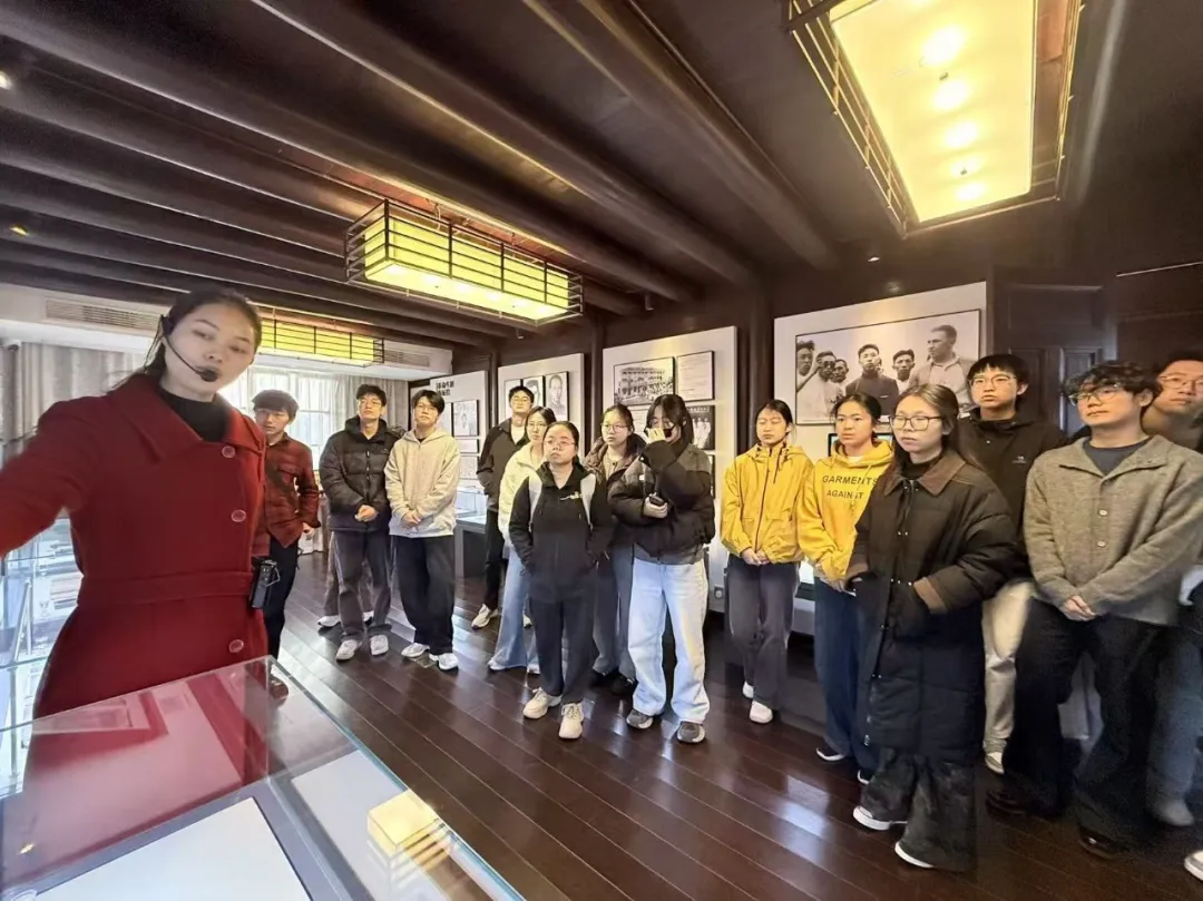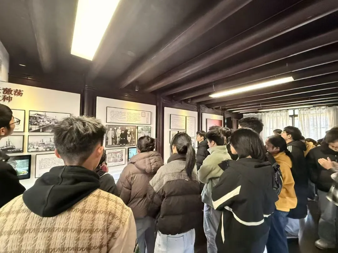 在讲解员的引导下,同学们认真观看了历史图片、文献实物与影像资料,深入了解了张人亚与其父亲冒着生命危险保存中国共产党早期重要文献的壮举。那一页页泛黄的党章、一封封珍贵的家书,无不令人动容,也让同学们深刻体会到早期共产党人对理想信念的执着坚守。