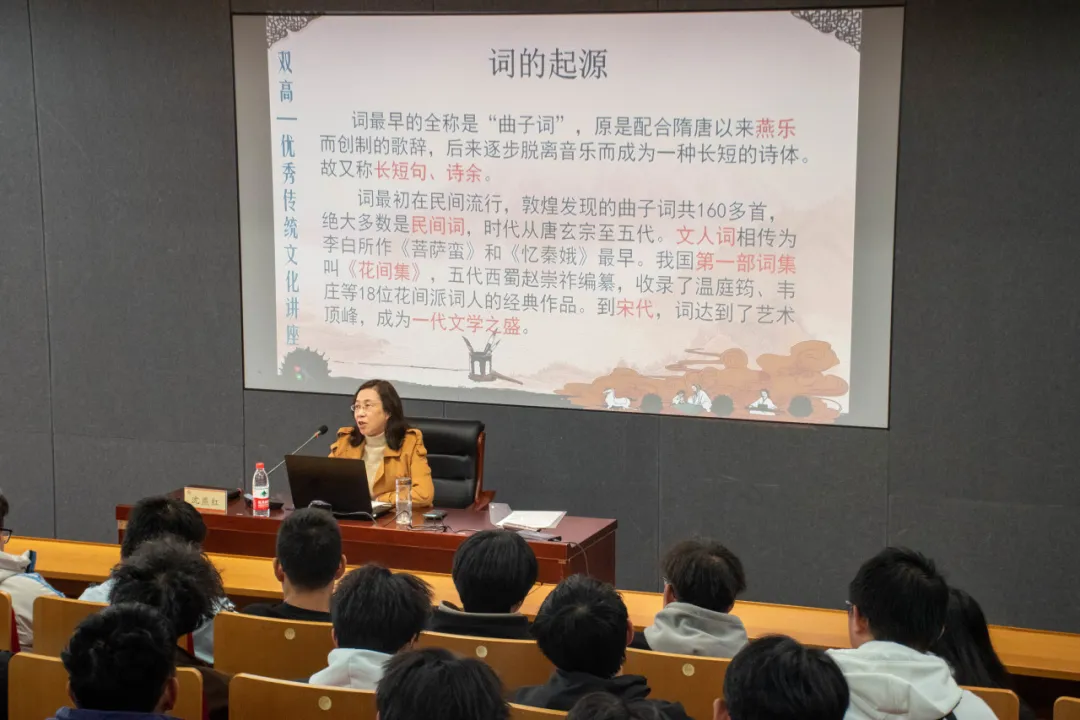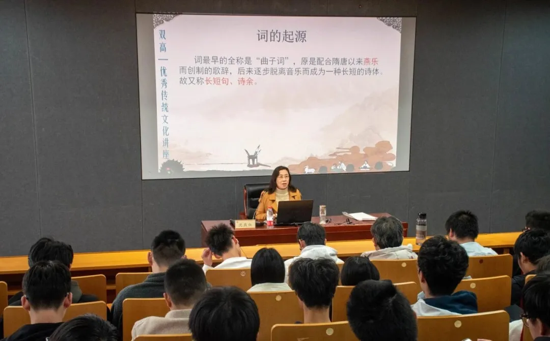为提升学生古典文学素养,深入感受词体文学的艺术魅力,11月27日,机电工程学院(中德智能制造学院)在联盟大厦天童厅成功举办《悲欢离合,浅斟低唱——唐宋词名家名篇赏析》主题讲座。本次讲座特邀宣传部沈燕红老师担任主讲,近百名学生到场聆听。