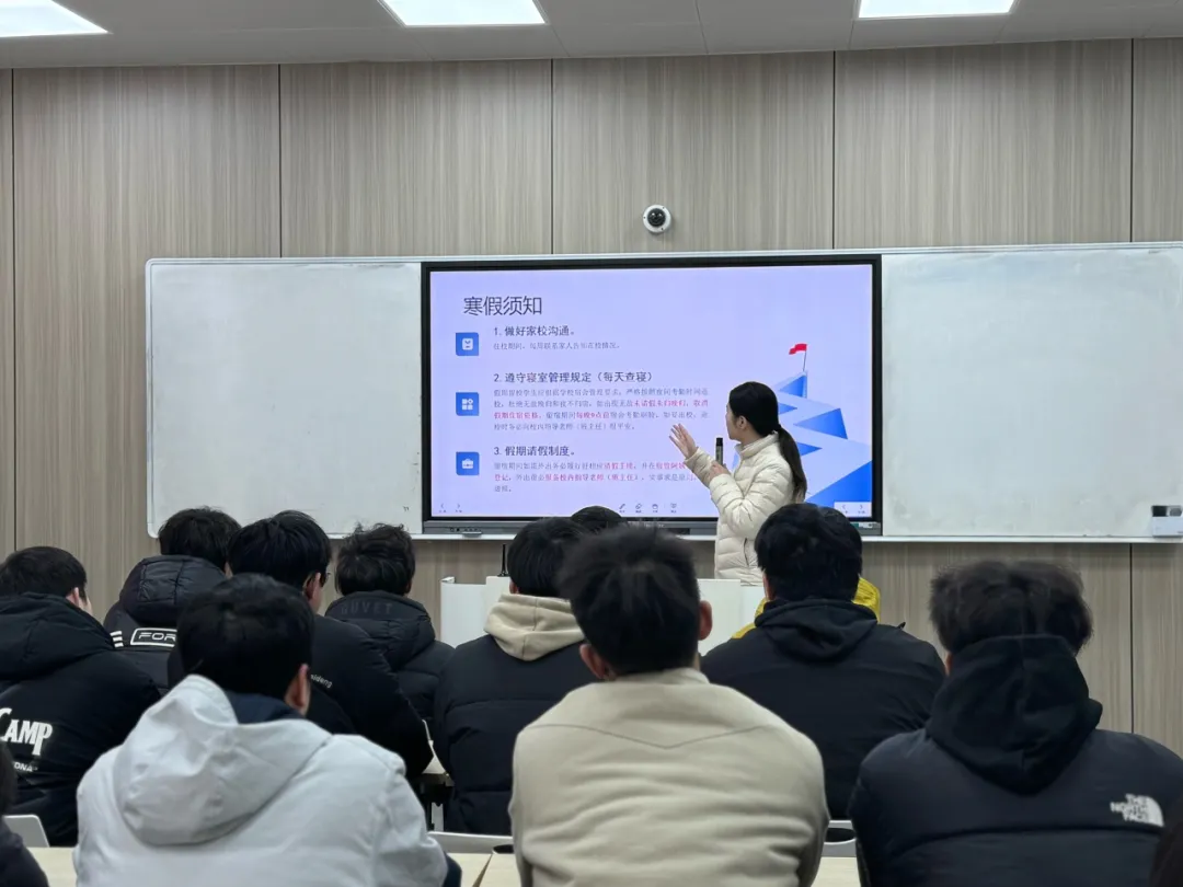 会上,陈希老师就寒假留校期间的管理制度与安全规范作了系统说明,重点围绕用电安全、消防安全与日常管理三个方面展开,要求同学们严格遵守宿舍用电规范,严禁使用违规电器,熟悉突发情况应急处置流程,同时自觉遵守晚点名、住宿登记与退宿等管理要求,保持通讯畅通,配合日常检查。